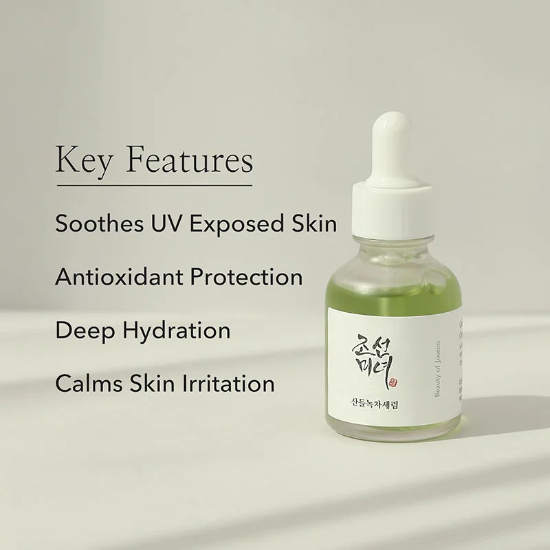 Beauty of Joseon Calming Serum Green tea + Panthenol – 30ml is formulated to alleviate skin discomfort caused by UV exposure and other external stressors.