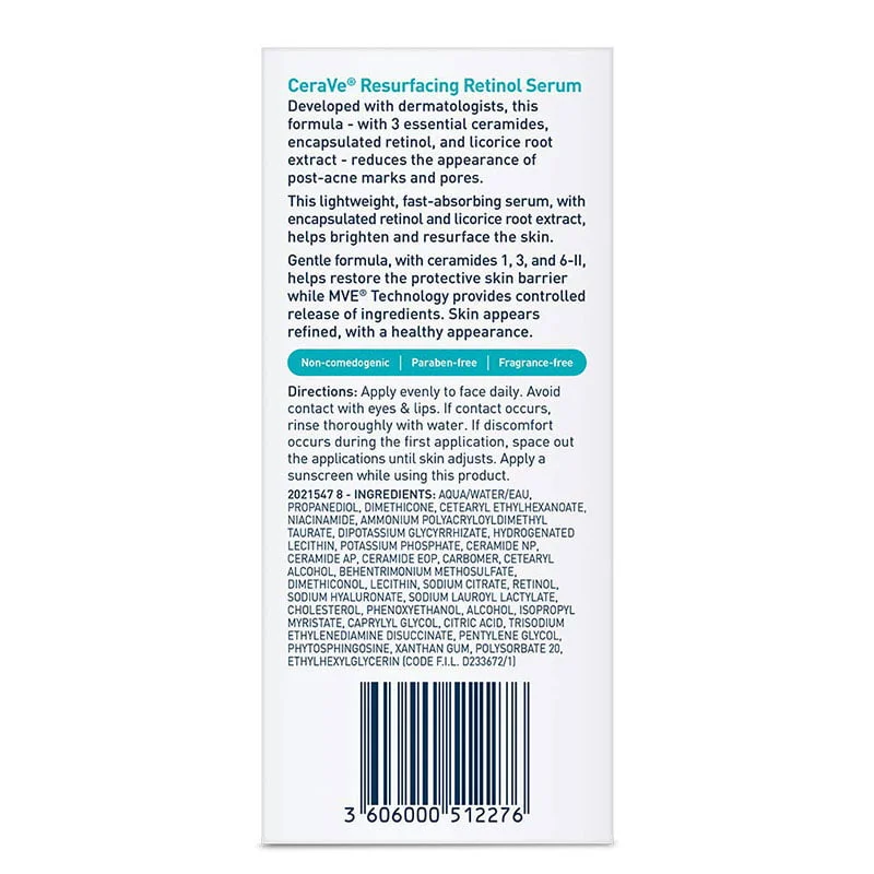 Developed with dermatologists, CeraVe Resurfacing Retinol Serum helps smooth your skin’s texture by reducing the appearance of post-acne marks, minimizing the look of pores and improving your skin’s surface. Our formula contains encapsulated retinol to help resurface your skin, plus licorice root extract to help brighten your skin’s appearance. In addition, it’s formulated with 3 essential ceramides that work together to lock in skins moisture and help restore your skin’s protective barrier, along with soothing niacinamide.