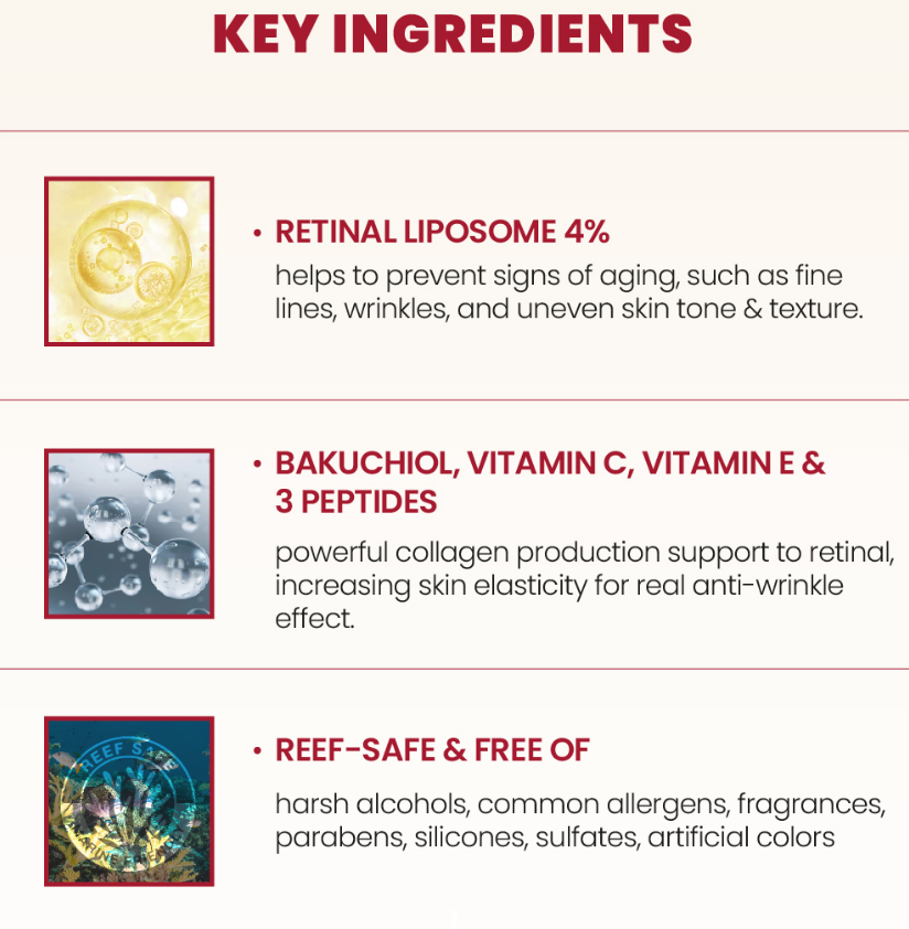 - Formulated with Bakuchiol, Vitamin C, E and 3 types of Peptides that support Collagen production to provide anti-wrinkle effect.
