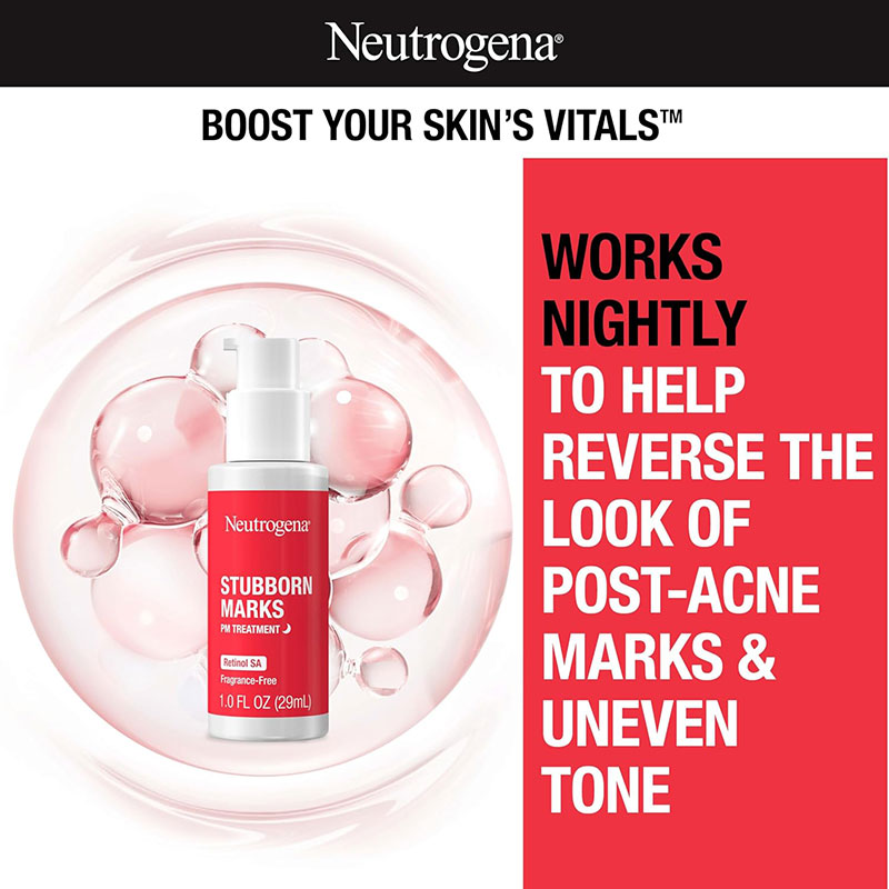 Visibly reducing acne marks while you sleep? It’s not a dream. It’s Neutrogena Stubborn Marks PM Treatment. Powered by Retinol SA, this derm-proven treatment exfoliates skin and speeds up cell turnover while you sleep.