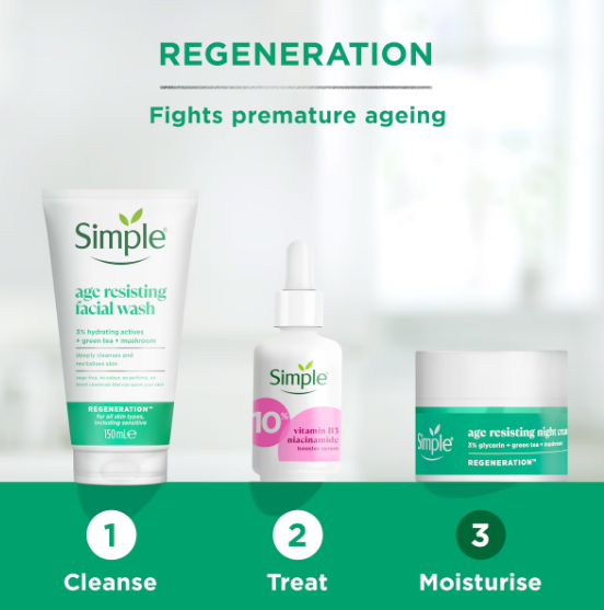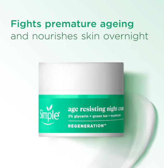 Simple Regeneration Age Resisting Night Cream is a powerful moisturiser for overnight skin rejuvenation. It’s enriched with 3% Glycerin, Green Tea, and Mushroom Extract that work harmoniously to replenish your skin while you sleep. This night cream is an effective blend that helps reverse the early signs of ageing, leaving your skin feeling smooth, nourished and youthful-looking. Simple has been creating skin-friendly products since 1960, always excluding harsh chemicals from our formulations. Our Age Resisting Night Cream is no different. Crafted with a blend of skin-loving ingredients, it provides everything your skin needs for overnight rejuvenation, and nothing it doesn’t – staying true to our promise of delivering simple and effective skin care. The Simple Age Resisting range is designed to provide nourishing care for ageing skin.
